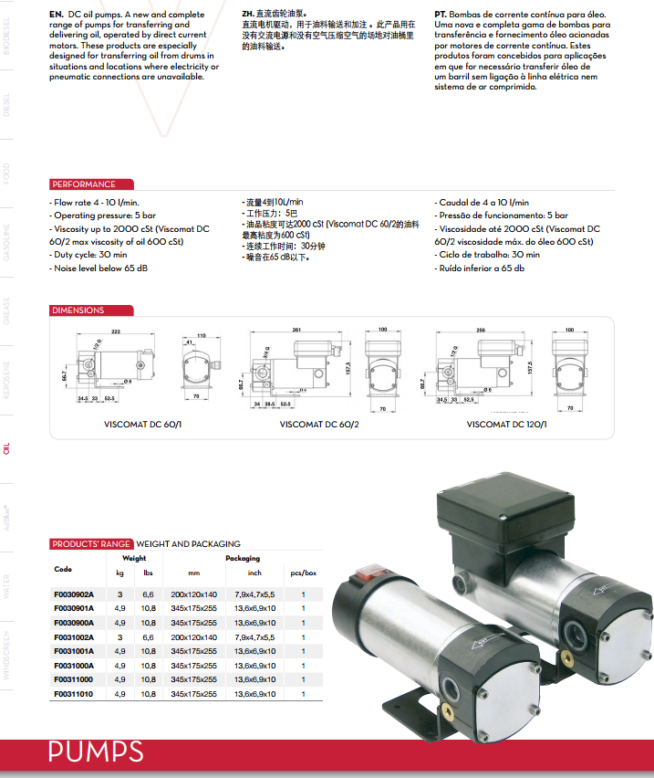 詳細說明: VISCOMAT DC 直流齒輪油泵。 直流電機驅動,用于油料輸送和加注 。此產品用在沒有交流電源和沒有空氣壓縮空氣的場地對油桶里的油料輸送。 - 流量4到10L/min - 工作壓力:5巴