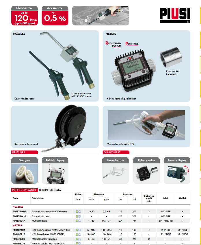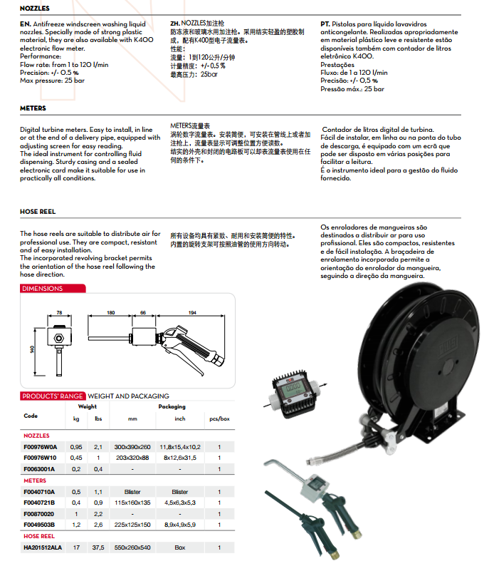 NOZZLES加注槍 防凍液和玻璃水用加注槍。采用結實輕盈的塑膠制成,配有K400型電子流量表。 性能: 流量:1到120公升/分鐘 計量精度:+/- 0.5 % 最高壓力:25bar